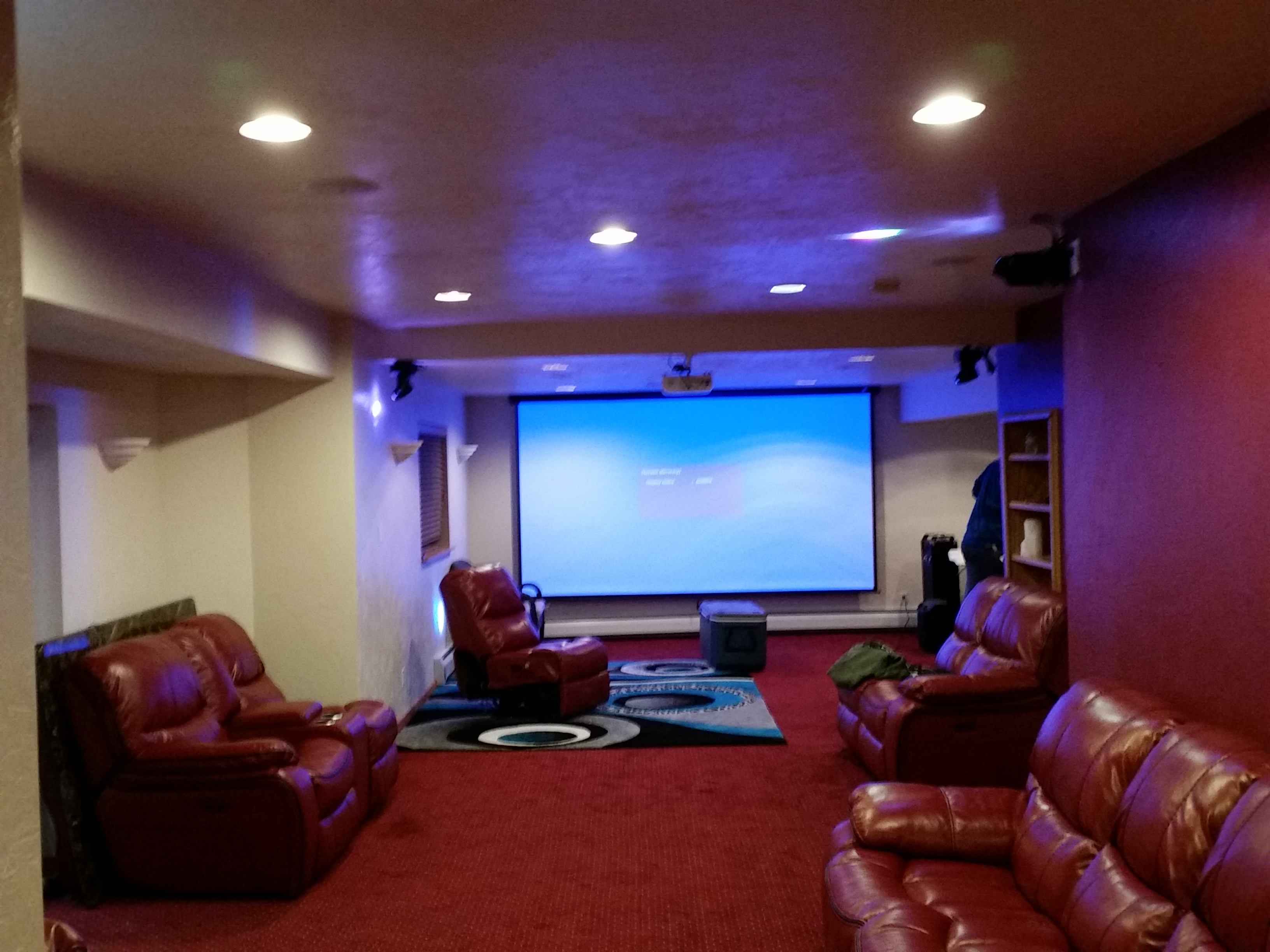 Home movie theater installation. this install got a 8 zone sound system nightclub lighting, including speakers near the hot tub, a 32" outdoor television, and camera system. We work exclusively with our own licensed insured contractors.